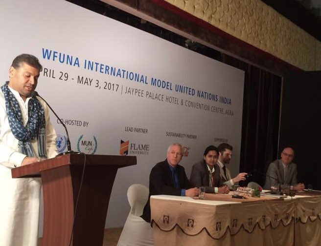 In the evening, before attending the dinner hosted by We Care for me, I spoke at the closing ceremony of WFUNA International Model United Nations (WIMUN) held at the Jaypee Palace Hotel & Convention Centre. I met Mr Gary Fowlie, Head of ITU, and few others.