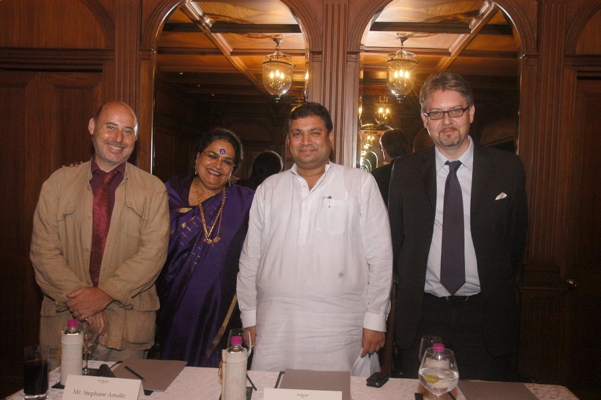 Sundeep Bhutoria with Stephane Amalir, Usha Utthup and Fabrice Etienne at the MoU signing between The Bengal and Alliance Francaise du Bengalie in Kolkata